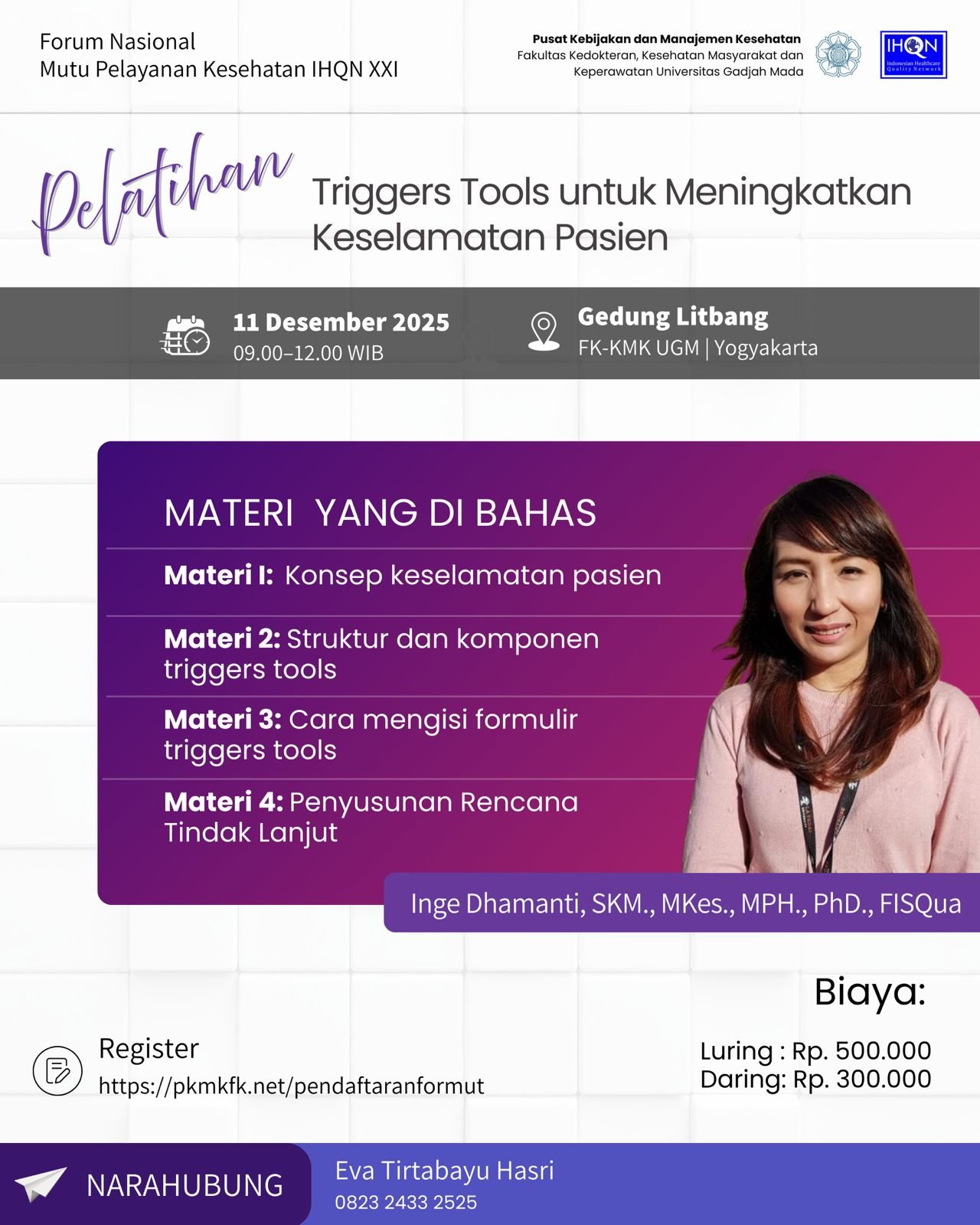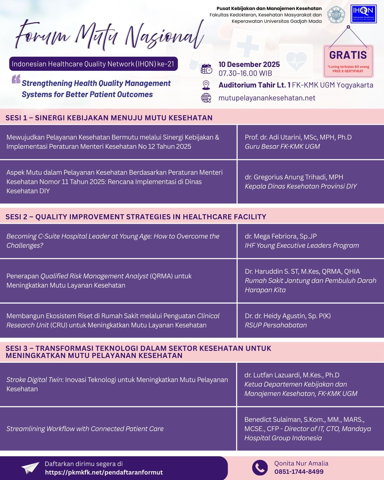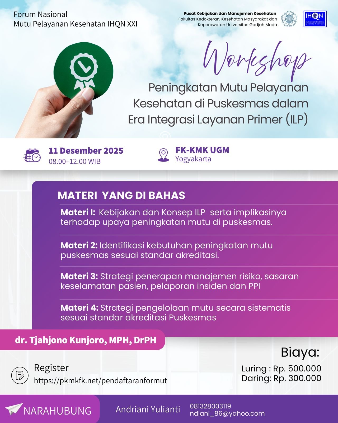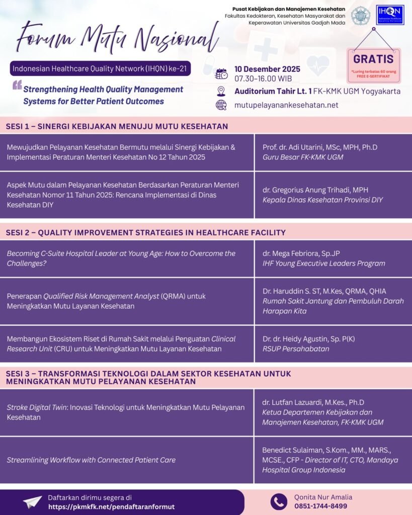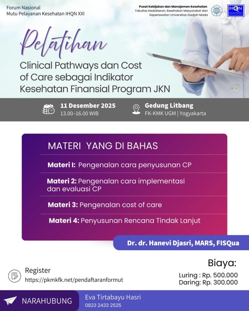 Rabu–Kamis, 10–11 Desember 2025 PKMK FK-KMK UGM Upaya peningkatan mutu pelayanan kesehatan merupakan prioritas strategis dalam pembangunan kesehatan nasional. Kementerian Kesehatan telah menegaskan arah kebijakan kesehatan melalui Peraturan Menteri Kesehatan…